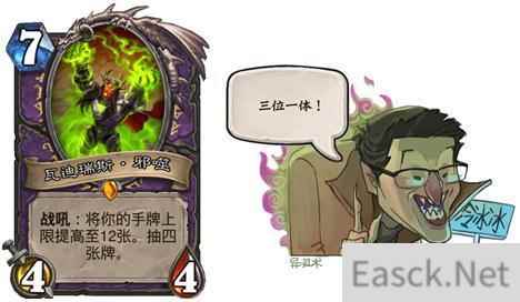除了这个随机获得两张龙牌的卡,还有将手牌上限提高的战吼效果!瓦迪瑞斯邪噬,战吼:将你的手牌上限提高至12张,抽四张牌。虽然是7费4/4的身材,但是这样的效果可以说是让整个打法与思路发生了很大的变化。不少玩家更是点名异灵术老师,怀疑他给暴雪写了信,要求增加手牌上限。