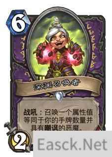 深渊召唤者可以和瓦迪瑞斯邪噬形成优秀配合,它的战吼效果是召唤一个属性值等同于你的手牌数量并具有嘲讽的恶魔。这样的效果在前中期可以让对手非常头疼,如果没有解牌真的会被恶魔给踢死,更多情况下也必须卖自己的随从和解牌,这样节奏就会断掉。