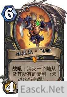 菲里克·飞刺被不少玩家评为最实用的随从之一。它的战吼效果是消灭一个随从及其所有的复制(无论他们在哪里)。回想前几个版本,生生不息的复制大军往往最难处理,这张新版本卡牌可以很好的埋伏对面一手,打断对面关键卡牌回手复制的节奏!