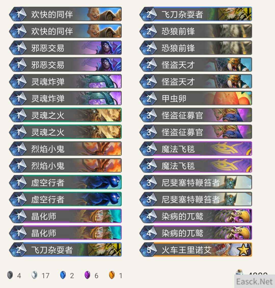 点评: 卡组思路还是偏向前期铺场,套牌里充斥着大量的低费生物,能很舒服的上怪抢节奏。 发力点是在3—4费,3费拍下尼斐塞特鞭笞者或是魔法飞毯都能得到很大的场面优势,而4费拍下染病的兀鹫或是跟班加怪盗征募官更是非常恐怖的爆发点。 套牌里有很多可以自残的卡牌,像烈焰小鬼、晶化师、灵魂炸弹、尼斐塞特鞭笞者都是裸下收益很高,能配合到染病的兀鹫就血赚。 卡组唯一的橙卡就是火车王了,这张卡只要你玩炉石的话肯定是要合一张的,中立火球术,用来补充伤害,所有的中快速卡组都可以带一张进去。另外紫卡方面能替换的只有晶化师了,换成海蛇蛋、甲虫卵或是其他1费生物都是可以的。 |