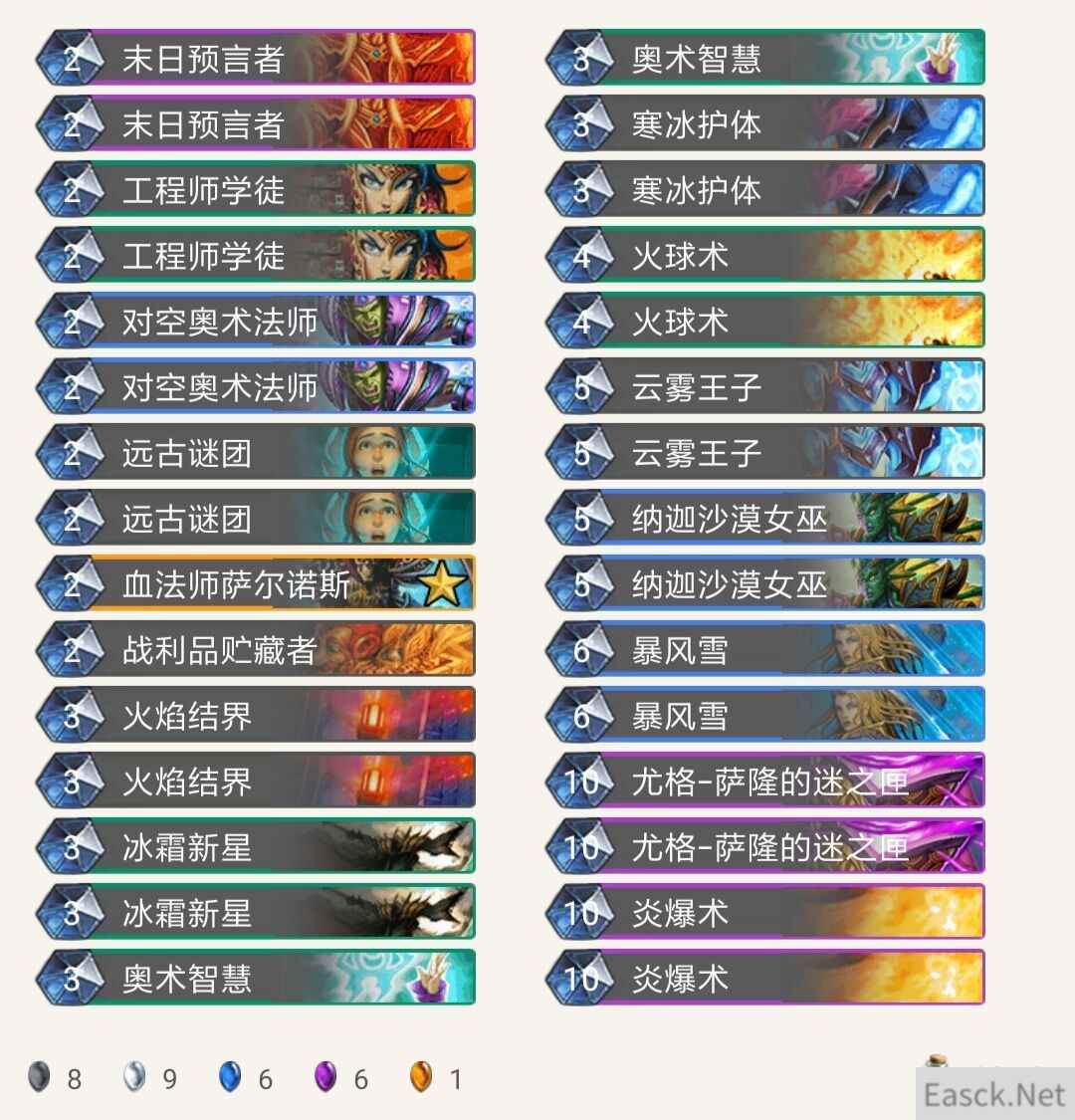 点评: 卡组思路也比较简单,前期通过对空奥数法师和火焰结界的奥秘体系解场,中期有冰环暴风雪接末日来控场,最后通过我们丰富的直伤来终结比赛。 卡组带有双火球双云雾王子双炎爆的直伤,共计44点,在对付大多数职业都是够用的,尤其是新手分段。沙漠女巫是为了给尤格—萨隆的迷之匣以及炎爆术减费,这样可以在十费的时候打出20点伤害,非常可怕,也可以提前打出迷之匣扭转战局。 没有血法师的同学可以换成第二张战利品贮藏者,这样卡组里只有6张紫卡,非常便宜。 这样一套强度和娱乐并存的卡组,相信你们稍加练习很快就会上手的。 |