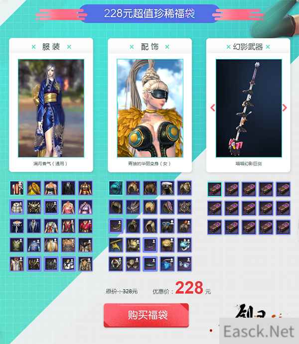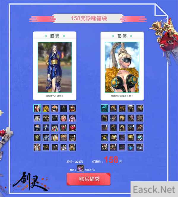 228元超值珍稀福袋 三档时装福袋满足不同要求 每档都能任意搭 在《剑灵》正在火爆进行的飞龙时装特卖会中,官方设置了三档时装福袋,用以不同玩家的购买要求。228元超值珍稀福袋中包括时装、配饰和幻影武器三类,158元珍稀福袋和68元福袋都仅有服装和配饰,不过玩家可在购买158元福袋和68元福袋后获得相应的神秘水道具。