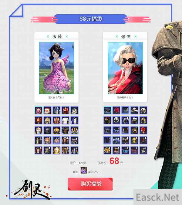 68元福袋 此外,在《剑灵》飞龙时装特卖会活动中,还会根据玩家累积消费情况,获得不同的VIP待遇。VIP等级越高,在活动中购买福袋还能额外享受折扣优惠,能以更低更超值的价格获取到心仪的时装、配饰等。 《剑灵》五岁生日在即,周年庆活动飞龙时装特卖会抢先到来,三档福袋限时售卖,上万种时装组合,将个性和时尚一网打尽。 |