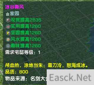 冰谷嘶风 观赏提高2835 实用提高1260 坚固提高1260 风水提高1260 趣味提高1260 需求宅邸等级:1 使用:可往家园仓库添加一种该园宅物件 颅血热,涂地当朱;霜刀冷,怒海成冰。 品质:800 物品来源: 名剑大会12段 玩家可在各大主城中找到NPC[许相迎]进行购买 |