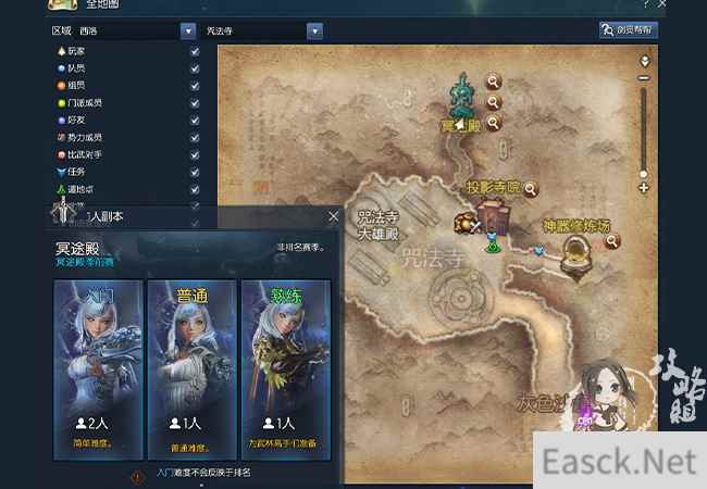 副本位置 冥途殿位于西洛咒法寺上方,分为简单/普通/熟练三种模式,其中简单模式下可双人组队,普通/熟练为单人模式,需完成无形神剑的指导(通关一次入门/普通模式)才能开启熟练模式,后续可直接进入。