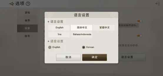 语言以及语言切换 在我们进入游戏的时候可能第一次出现的是英文版的语言以及语音,这时候不要慌,也不要以为是你下载错版本了。我们可以在主界面的右下角进行设置。