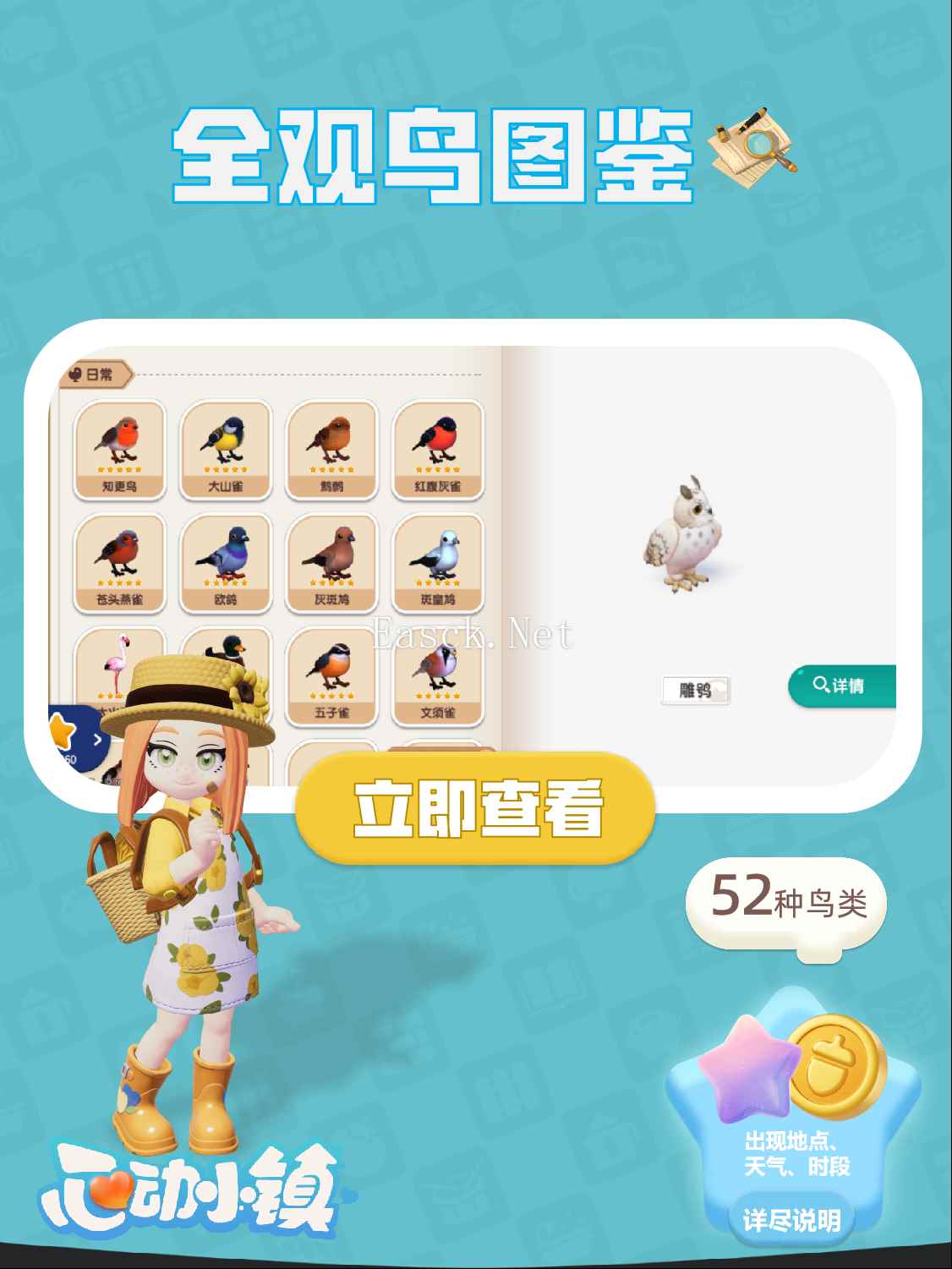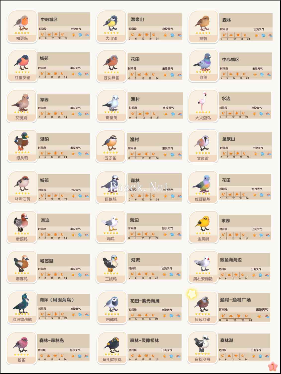 《心动小镇手游》观鸟全图鉴攻略来源:taptap:吱大王 从上到下、从左至右,按照图鉴顺序排列~ 观鸟小tips: 观鸟等级不够、拍到高等级鸟是无效的; 鸟基本全是全天段出现,部分鸟对应天气才会出现,左上角有小星星的,就是有天气限制的鸟,大家稍微注意下哦; 前期需要刷等级,可以对着一只鸟一直拍照,刷观鸟经验; 有些地方要注意观察树,鸟有可能藏在树上;