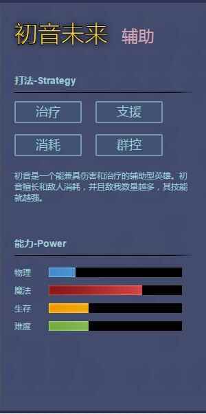 初音未来在幻想全明星中是一位辅助型英雄,主要走下路位置,辅助ADC.该英雄不仅具有魔法伤害能力,还能治疗队友,并控制沉默敌人,操作十分简单,对于萌新们来说是一个不错的选择。那么在游戏里初音未来厉害吗?技能效果是什么?小编接下来就为大家带来一篇幻想全明星初音未来介绍,一起来看看吧。