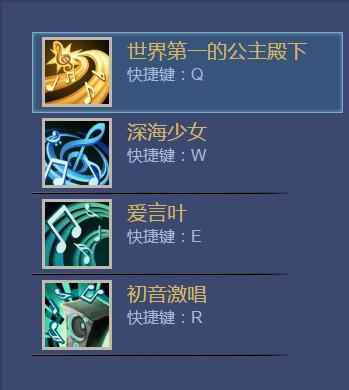 世界第一的公主殿下 向目标区域投掷一个音符,对范围内敌人造成魔法伤害并附加[音符]效果。 深海少女 放出一个混合音符在范围内敌人和友方之间弹跳,对敌方造成魔法伤害或对友方进行治疗,吞噬[音符]效果来提高效果,并额外对敌方产生减速或友方加速。 爱言叶 对周围友方英雄放出音符,为他们进行治疗并附加[音符]效果,每治疗一个友方英雄,初音也会获得一些治疗。 初音激唱 为周围敌方和友方单位附加一层[音符],持续施法时减速周围敌人,并激活大范围内所有的[音符]来对敌人持续造成伤害或对友方持续治疗,施法结束时还会沉默周围敌人。 |