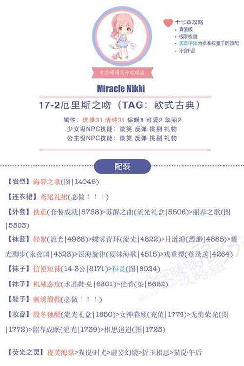 这里是《奇迹暖暖》少女级难度的第十七章17-2厄里斯之吻的攻略。少女级还是可以容易过的,这里搭配攻略已经很详细了,用基本中等平民的衣服就没有问题了,当然如果没有一样的衣服,小伙伴觉得同类型的衣服不错也可以多尝试。下面是给大家带来17-2厄里斯之吻S搭配建议。希望可以帮助到大家。 【少女级】第十七章