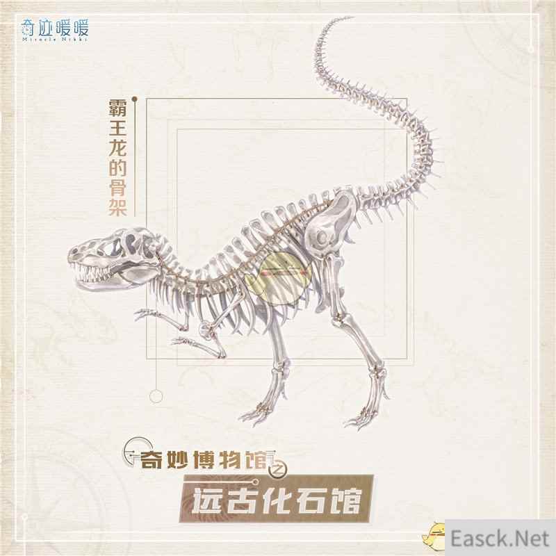 【始祖鸟的骨架】、【华阳龙的蛋】、【史前水生物化石】、【雷克斯暴龙】及【史前梦游记】套装,均为可翻取的“稀有限定”纪念品奖励! ———远古化石馆·可移动摆件限定——— 著名的陈列品霸王龙骨架,要与它合影一次非常困难。 据说它比大喵还要能吃,暖暖发出了惊叹的声音。