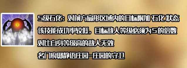 14、5级石化 石化技能,名门府邸静语庄园中最后boss前有个小门神叫做庄园守卫,把他打残才会进入boss——在boss阶段中他会再次出现,将他打到20%血量以下的时候就有可能施放5级石化了。打完这个庄园的守卫,如果没有学会技能的话建议自杀或者被boss打死,这样重置boss战斗的话又可以再刷一次,直到学会为止。