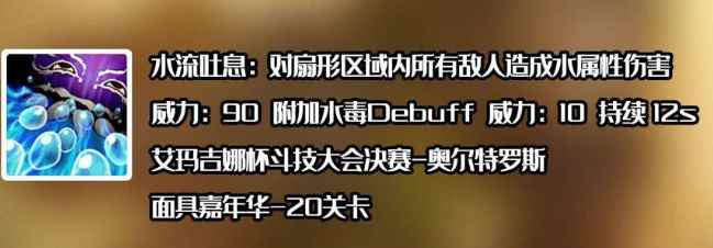 3、水流吐息 水系AOE,附带水毒。学习方式很多,水神中有可能学会这个技能。推荐的方式是在前往斗技场学习4星吨和鼻息的时候顺便蹭到,请搜索技能鼻息以查看具体的斗技场流程和注意事项。