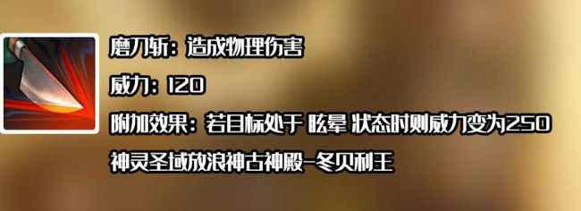 15、磨刀斩 唯一的物理斩击技能。神灵圣域放浪神古神殿的最终boss冬贝利王的技能,他必定会在出现“打磨好的菜刀”buff之后数秒内使用此技能,之后便可击杀。拉诺西亚高地的A怪玛贝利亦然,但是概率都差不多,并不像其他野外学习和副本学习的区别那样,有着明显优势。