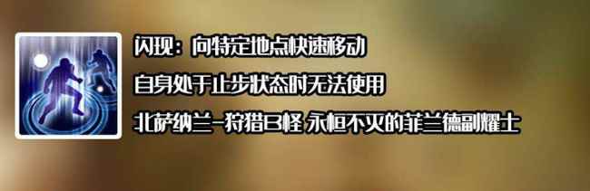 7、闪现 指定的位移技能,必学技能之一。北萨纳兰的B怪永恒不灭的菲兰德副耀士会使用这个技能,并没有读条。建议寻一70级职业平A拉住B怪,然后使用后跳或者冲刺技能来拉开距离,一旦看到其进行位移移动之后便可以进行击杀。
