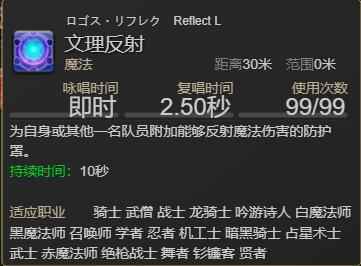 最终幻想14里面的文理反射由文理护盾加文理魔盾加祭司的记忆合成获得,效果是为自身或其他一名队员附加能够反射魔法的防护罩,持续时间为10秒,这是个只能在优雷卡涌火地图中使用的技能。
