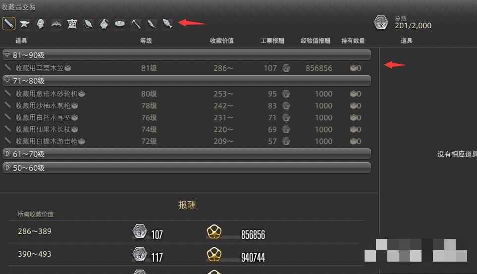 3、此时就能够看到各种生产 采集职业所要的交纳的收藏品以及报酬了