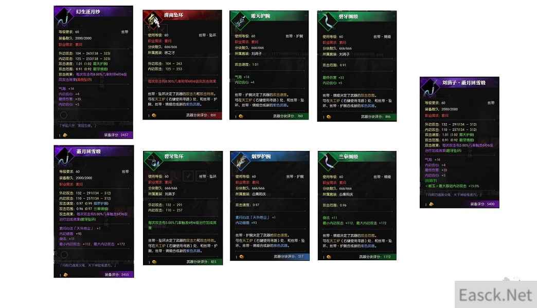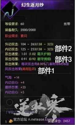 部件1:决定基础内功外功数值和攻击效果 部件2、3:决定攻击速度/攻击范围和4个紫色词条 (注:部件无法洗练哦!) 这边给大家两个武器练手,可以对照下武器部件表,看看能重组成什么套装(答案放在最后)