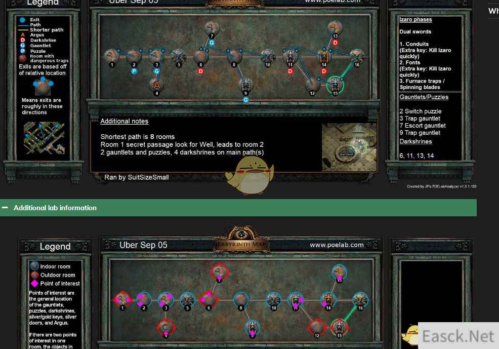 一张图大家都熟悉了就是平时的迷宫图,解释下第二张图,第二章图里蓝圈表示是室内图,红圈表示是室外图,上面紫色的点标注的是诸如试炼,银箱子,银钥匙这些东西的方位,更加方便跑迷宫的人少走冤枉路 今天最短8个房间 今天阿格斯在4号房间 今天没有房间有较危险的陷阱(地图红圈标注) 1号房间密道通向2号房间 2个趣味挑战(地图标注P和G)和4个暗影祭坛(地图标注D)在主路线上 现在开始不评价迷宫图(因为发现不同的人对迷宫好坏的看法实在是差异巨大,有只跑附魔的,有跑附魔同时顺路的祭坛会拿的,有只拿主线祭坛和钥匙的,有祭坛钥匙一定全跑的,有不拿银钥匙的,有一定要开所有白银宝箱的,有小王必杀的,有小王不在主线就不理的,有无视任意陷阱的,有很怕陷阱只要陷阱多就认为是差图的,有跑的飞起单纯的直线等于没有的药侠,有直线距离也很在意的正火,有不在意祭坛buff祭坛在哪完全无所谓的,有炒鸡希望祭坛在迷宫前段越多越好要早点拿到加成的……实际上目前的迷宫,只有亲自跑过一趟才能得出对自己适合的结论) 关于迷宫祭坛给的随机效果,更新之后所有效果右上角都有显示 稳定最大6把钥匙(除非阿格斯不在)(现在右下角标准的趣味挑战中,必然有两个包含两把古铜钥匙,已验证,另外普通白银宝箱,暗影祭坛和最终boss迷宫宝箱均有机会出古铜钥匙,但这些随机的不计入考虑) 左边图上标注了房间上方的蓝点意味着你要往哪个方向走 拿齐钥匙攻略: 1.杀死4号房间的小王阿格斯 2,第一阶段不点击元素雕像,王有buff增幅元素伤害和抗性情况下击败王(可以速杀) 3.第二阶段不摧毁会释放诅咒的水晶塔情况下击败王(可以速杀) 4.1,2阶段均满足条件的情况下,第三阶段王将获得较大的辅助,比较难打,但能掉落3把古铜钥匙 5.在右下角标注的几个趣味挑战(图上标注P和G的都是)的其中两个里获取两把古铜钥匙 今天boss形态为双剑伊泽洛 形态难度:双剑>剑盾>双手锤 爆发伤害:双手锤>双剑>剑盾 |
