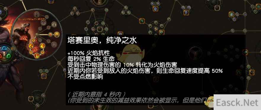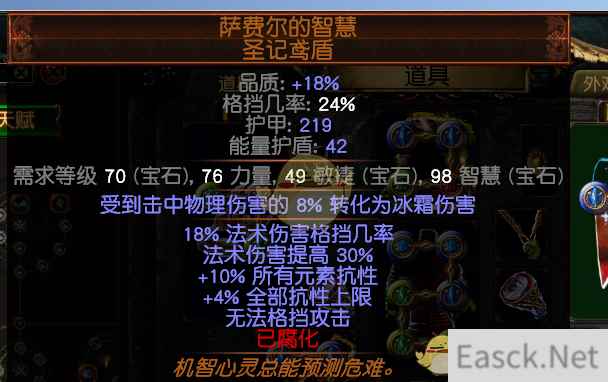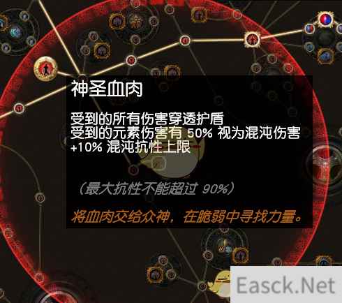 2,瓦出物理转伤的正火暗金盾(这个开荒可以先不用瓦),这个盾效果可以提高所有所有抗性上限4,包括混沌抗性,结合神圣血肉跟其他装备就可以把混沌抗性堆到90,元素抗性堆到79,最终效果相当于有了90的混沌抗性,84的元素抗性,并且有了大概7%的物理减伤效果