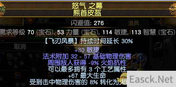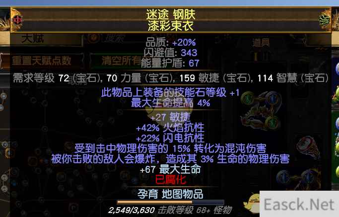 3,需要胸甲来提供爆炸效果与物理转混沌属性,这个是后期用觉醒爆炸词缀跟混沌转伤获得的,提供清图速度跟大约13%左右的物理免伤,开荒期可以用六连衣服用极恐精华点一下代替