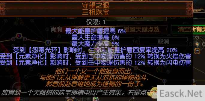 6,三相珠宝提供(各种光环转伤可以自己自由搭配)我是选择双元素净化获得24%的物理转伤,这个开荒的时候可以不考虑
