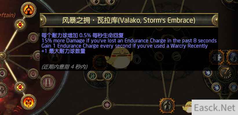 这个点多了一个近期使用战吼4秒里面每一秒钟多一个红球 然后使用了红球之后最近8秒加15%总伤害加成。 还+1个红球上限。。生存伤害全有了(勇士哭了、勇士哭了、勇士哭了、勇士哭了、勇士哭了) 国际服体验就是双手近战比较吃装备,想在开荒时期就发力很难。我POB跑了一下自己的DPS 对BOSS BUFF全开大概是80W的样子。 不过这是因为我装备太次。后期有极品一些的暴击高DPS稀有武器 长杖或者斧头 (斧头需放弃震波)DPS会高很多。 流放之路新赛季福利活动推荐:点击查看 BD优缺点 优点 双手猛击系技能配合新的+范围的战吼可以达成一键清屏。加上我用着震波刷图速度还是很快的。打击感和刷图体验感觉很不错,一击下去山崩地裂的感觉 光污染哈哈。T10以前打BOSS也基本是2-3锤搞定 缺点 想发力会比较吃装备。需要属性好点的稀有武器和其他饰品。前期过度时比如我视频中那样。会造成伤害刮痧。走位不好可能连给BOSS刮痧的机会都没有。(新手劝退) 开荒建议 直接野蛮人出门拿到裂地之击。前期选择武器 单手斧 或能捡到高伤害的双手斧 锤的话 用双手的也行 前期3连 裂地之击 瘫痪 几率流血 记得买血与沙跟战旗 血姿态加范围伤害 战旗开了可以加命中和使周围的敌人受到物理伤害增加第二章 近战物理伤害替换瘫痪 如果有4连 瘫痪继续带着。 如果有高伤害双手锤或仗5连加震波再带上纯洁之捷 灰烬之捷 到了第三章28级做了派蒂的任务就可以拿到破釜一击了 技能链接一样剧情升华点出转火焰之后有6连使用破釜一击-近战物理伤害-震波-武器元素伤害-护体-附加火焰伤害(到异界换成火焰穿透) 其他防装只需要找血量和抗性就行。记得任务给的武器选双手锤或者斧之类的国服送的武器都挺好的拿到之后大概率高伤武器。然后去自己家里附魔个物理伤害提高就行 开荒天赋 你使用什么武器就点什么武器的进阶天赋。 升华先点出50%物理转火和 吸血 +10%力量的点这个点会使BOSS受到火焰伤害增加20% 而且还会降低他的移动速度