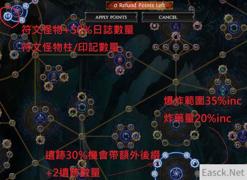 地图选用 -理想上我们会需要窄地形的地图以利集中目标,但靠着天赋的炸药距离/数量加成足够应对大部分的情况了。 -另外,地图的物品数量会影响到该机制物品的产出,所以情况允许尽量使用高物品数量的地图(+甲虫)进行事件。 引爆/放置技巧 -因为有益词缀是相对单纯的,所以最佳解也比较固定,最高收益(机制本身)的几个遗迹词缀依序是: --双倍符文怪物(这是前缀,非常稀有) --符文怪物的坟书掉落数量50%iiq(数量增加) --40%怪物iiq -选完所需的词缀为前提,地图内任何一个箱子或普怪都比不上符文怪物的效益,如果有符文怪的前提不建议将炸药浪费在其他普怪/箱子/无所谓的遗迹上。 2.日志备战 -每一本日志会有2-3个区域,都会对应到指定的NPC/通货: --大肠骑士(Knight of the Sun) -丹宁/大哥 --黑镰佣兵(Black Scythe Mercenaries) -图金 --德鲁伊破碎之环(Druids' Broken circle) -桂温妮 --圣杯冠位指定者(Order of the Chalice) -罗格 -通常有太阳/丹宁都是优先选,不过如果有什么偏好的选项(EG 我就是想赌博)就以自己的偏好为主。 -如果很犹豫要选啥,也可以用地区/基底做为考量。 地区选择 -地区共有15种,有着不同的地形以及地区限定的遗迹,关于限定什么可以参照[ POEDB ] -以下为作者亲自跟坟头SOLO了三个赛季推荐的地区一览: --好: Forest Ruins, Dried Riverbed, Vaal Temple, Shipwreck Reef森林废墟、干枯河床、瓦尔秘殿、船骸礁岩。--凑合: Battleground Graves, Karui Wargraves, Bluffs, Utzaal Outskirts, Cemetery, Scrublands, Volcanic Island, Desert Ruins战地、卡鲁、峭壁、乌扎尔、火山、沙漠 --糟糕: Sarn Slums, Mountainside, Rotting Temple 萨恩、山坡、腐坏神殿 基底选择 -日志不同区域也会有不同的基底词,自然也有好坏之分 -要注意基底的ROLL值甚大,使用坟图前务必准备祝福石拉高部分词缀的数值,提高日志效益。 好词缀,以下词缀建议ROLL高: --增加炸药数量 --增加炸弹范围 --增加炸弹放置距离 --增加符文怪物印记数量 凑合词缀: --增加遗迹数量 --增加怪物掉落的神器数量 --机率增加额外后缀 --额外箱子 --箱子机率双倍奖励 无关紧要的词缀,使用祝福石时没必要特别拉高以下数值: --增加普怪印记数量 --额外地底区域 另外还有一个论外词缀为必定生BOSS,情况允许建议将此种类的地图进行分裂动作(只能用野兽,不能用化石)。 3.打日志 -进入日志后小地图打开放大,看有没有类似这个图标