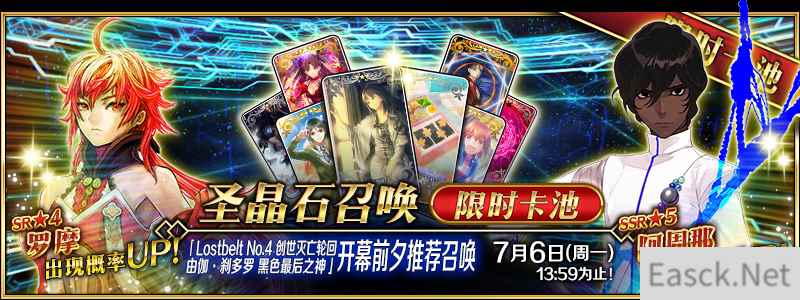 『「Lostbelt No.4 创世灭亡轮回 由伽·刹多罗 黑色最后之神」开幕前夕推荐召唤』◆ 时间:2020年6月22日(周一)维护后~7月6日(周一)13:59为止 限时卡池『「Lostbelt No.4 创世灭亡轮回 由伽·刹多罗 黑色最后之神」开幕前夕推荐召唤』开启! ※尚未通关第2部 第3章「Lostbelt No.3 人智统合真国 SIN 红之月下美人」的御主也可参与『「Lostbelt No.4 创世灭亡轮回 由伽·刹多罗 黑色最后之神」开幕前夕推荐召唤』。 「★5(SSR)阿周那」、「★4(SR)罗摩」将参与推荐召唤!