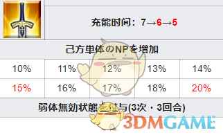 3、施しの英雄(聖夜) EX 充能时间:7~5 付与己方单体:NP增加10%~20%,弱体无效状态(3次·3回合)