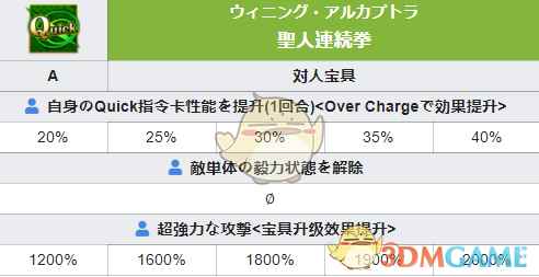 四、宝具 1、宝具效果 绿卡宝具:圣人连续拳 付予自身:Quick指令卡性能提升20%~40%(1回合)<Over Charge时效果提升>。 对敌方单体:战续状态解除,超强力攻击1200%~2000%<宝具升级效果提升>