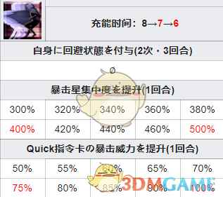 2、閃光の拳 A 充能时间:8~6 付与自身:回避状态(2次·3回合),暴击星集中度提升300%~500%(1回合),Quick指令卡暴击伤害提升50%~100%(1回合)。