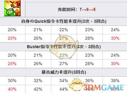 三、持有技能 1、フットサンタ A 充能时间:7~5 付与自身:Quick指令卡性能提升20%~30%(3次·3回合),Buster指令卡性能提升20%~30%(3次·3回合),暴击伤害提升30%~50%(3回合)。