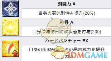 二、固有技能 1、对魔力 A:自身的弱化耐性提升(20%) 2、神性 A:赋予自身伤害附加状态(200) 3、ハードパンチャー EX:自身的Buster指令卡的暴击伤害提升(12%)