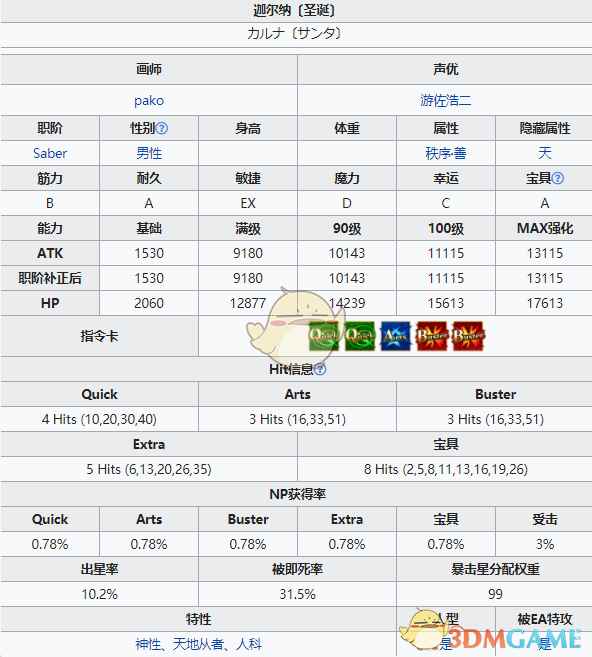 《FGO》圣诞迦尔纳从者技能介绍一、基础属性 1.配卡:2绿1蓝2红,4/3/3hits数,EX5hits,宝具(绿)8hits。 2.NP率:0.78% 3.基础ATK/HP:9180/12877(80级)