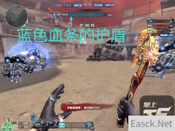 护盾:在掉落一定血量之后,BOSS会生成护盾,表现为血条变为剩余100%血量的蓝色血条,击碎护盾之后会变回原先的红色血条。 护盾持续期间,玩家对BOSS的攻击更易获得积分,但是BOSS会免疫一切减速效果。