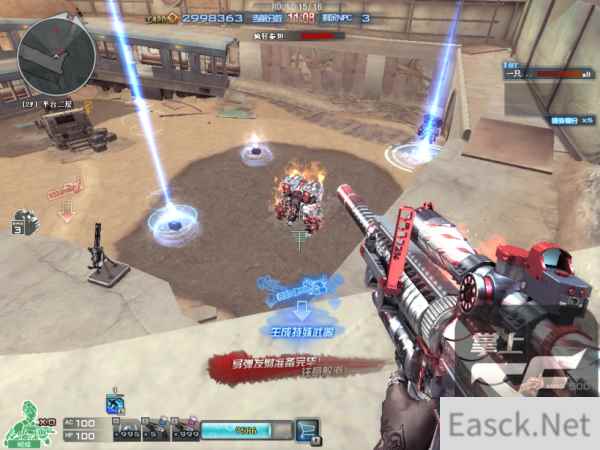 地狱炮击:仅在每次刚开启护盾之后,可以使用一次;会对全图范围内N处圆形区域实施轰炸打击,会在很短的间隔时间内轰炸五次。 轰炸时地面会有红色的警示,轰炸的圆形区域较大,技能释放延迟较短,如果不是距离圆形区域边缘较近的话很难躲避,伤害非常高,即使拥有AC+高减伤套,一次轰炸也会掉大半血。(好消息是,这时可以使用护盾手雷免疫炮击)