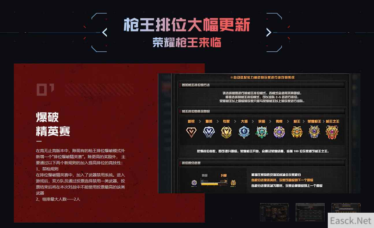 在竞无止竞版本中,除现有的枪王排位爆破模式外 新增一个“排位爆破精英赛”。除更高的奖励外, 主要通过以下两个新规则的加入提高排位的竞技性: 1、禁枪规则 在排位爆破精英赛中,加入了武器禁用系统。进入 游戏后,双方队员通过投票选择禁用一类武器,投票结束后将在本次对战中不能使用投票最高的该类武器 2、组排最大人数——2人 |