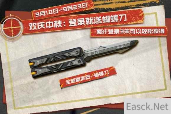 《使命召唤手游》蝴蝶刀获取方法介绍获取方式 玩家在使命召唤2022中秋节的活动中累计登陆3天即可获取全新副武器“蝴蝶刀” 活动时间 2022年9月10日——9月23日 武器展示