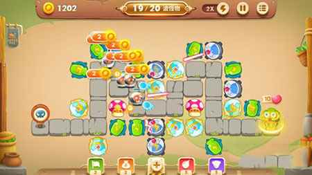 首先观察地形和炮塔,那么我们可以把蘑菇放在中间的位置,因为它的攻击范围是一个圈,所以放在这里会发挥最大的价值,接着我们需要来攻击中间那个钱箱,所以小编选择了瓶子炮来攻击。