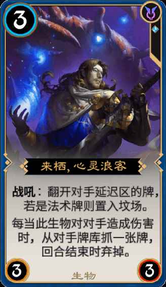 来栖,心灵浪客是一位神秘感十足的剑士,他手中的强大的而又奇怪的武器能够征服巨大的海兽,轻松的控制它们。他还研究了心灵操控的法术来对付敌人。他是《秘境对决》中的一张蓝色生物卡。 来栖,心灵浪客 费用