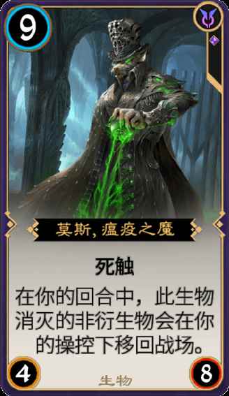 莫斯可以说是瘟疫的代名词,所到之处瘟疫遍布,寸草不生,这与他的斯文的性格是那么的不符,也是因为他首先污染了水源,才打开了攻破泰拉的道路。它是《秘境对决》中的一张黑色生物卡。 莫斯,瘟疫之魔 费用