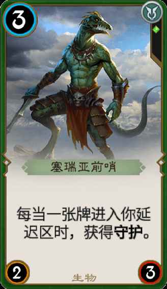塞瑞亚前哨的重要性不言而喻,他们能够有效的避免正面与半人马冲突,在危险到来前就能提前做好准备,毕竟真的打起来蜥蜴人根本不是半人马的对手。它是《秘境对决》中的一张绿色生物卡。