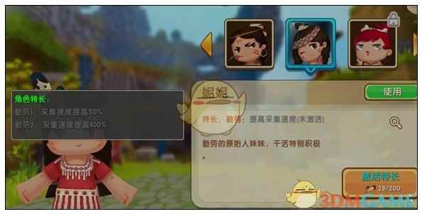3、使用角色“妮妮”,并激活特长,激活特长后的妮妮也能提升采集速度。