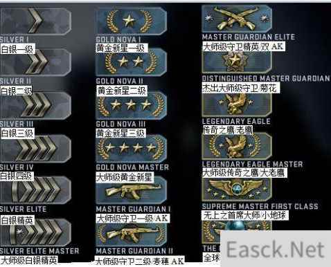 csgo排位等级有哪些: 白银—至四级 白银精英 大师级白银精英 白银阶段都还算是新手 黄金新星—至三级 大师级黄金新星 黄金阶段已经达到csgo的平均水平了 大师级守卫—至二级 大师级守卫精英 杰出的大师级守卫 大师阶段算是一名高手了 传奇之鹰 大师级传奇之鹰 老鹰阶段技术已经达到大师水平 无上之首席大师 全球精英 首席和全球阶段是csgo中大佬,被称人型外挂 |