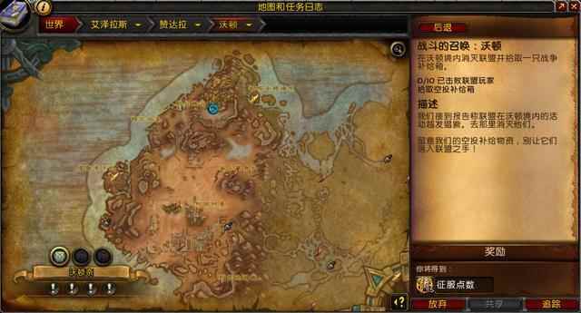其中分为PvE模式和PvP模式,PvE模式分为三个难度,需要一定装备等级后可以像随机副本一样查找队员后加入,而PvP模式则需要你提前自行组好三人小队。 海岛冒险是8.0版本中获取艾泽里特点数最快、最有效的方式。在这个界面上方的进度条会告诉你在本周的海岛探险中你共收集到多少艾泽里特,一旦达到要求就可以获得奖励,这一数值每周重置。 7. 为了女王!为了部落!杀光他们! 以上内容都以PvE为主,但在《争霸艾泽拉斯》这样的大环境下怎么可能不杀起来呢? 满级后,在赞达拉港战争指挥部,你将会接到"战斗的召唤"任务,要求你在战争模式下拾取空投补给、击杀联盟玩家。