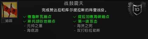 《魔兽世界》8.0部落满级后续之攻略指南 1. 完成阵营战役前半部分 所有在任务末端有小型部落徽记的任务即是阵营战役任务。 在练级过程中,你可能已经完成了阵营战役的前四步:三张库尔提拉斯地图的据点建设、海岛探险的单人教学关(在赞达拉港左下方寻找雷兹奥昆船长)