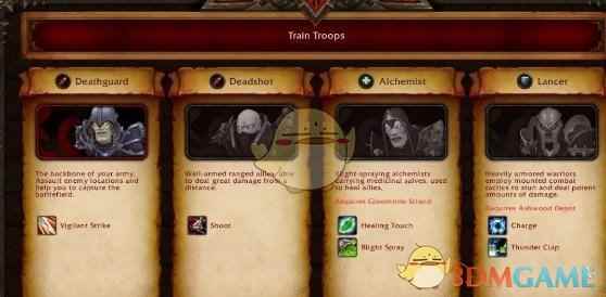 占领了巴莎兰以后,玩家可以建立兵营、军械库和风暴祭坛。参加过激流堡之战的玩家对这些应该很熟悉。 仍然需要收集铁矿和木材来建立这些建筑,新的矿洞在东南方,伐木场在东北方。不一样是玩家将可以从被摧毁的投石车和投刃车里收集木材。 部落兵营的兵种如下:
