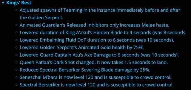 诸王之眠 调整副本中在黄金风蛇前后的繁盛怪物的刷新数量。 p 活化守卫施放的控制剂只提高近战急速。 p 阿库尔大王的隐秘刀刃的持续时间降低到4秒(原为8秒)。 p 防腐液的持续Dot伤害时间降低到6秒(原为10秒)。 p 降低了黄金风蛇的活性黄金75%的血量。 p 降低守卫队长阿图的飞斧弹幕的持续时间到6秒(原为10秒)。 p 帕特拉女王的黑暗射击已修改。现在需要1.5秒。 p 降低幽魂狂战士切裂之刃25%的伤害。 p 总管姆巴拉现为120级,并且吃控制。 p 幽魂狂战士现为120级,并且吃控制。 p