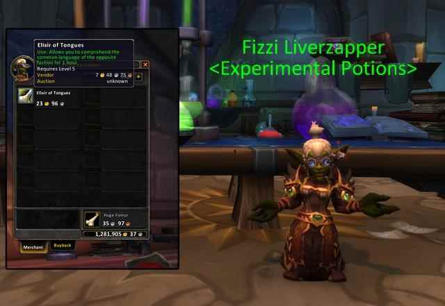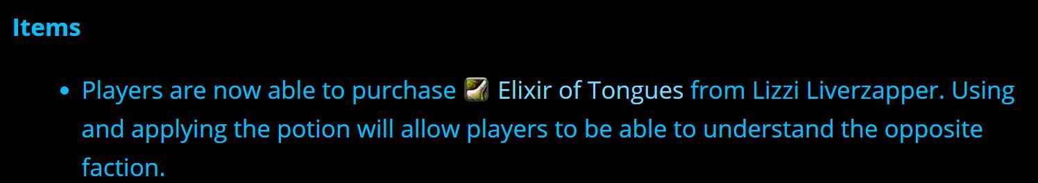 物品 玩家现在可以在菲兹·电胆处购买语言药剂。喝下这个药剂能够让玩家听懂敌对阵营玩家说的话。 p